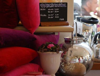 Die Augen haben viel zu entdecken durch wundervoll arrangierte Blumensträuße und unsere sehr exponiert ausgestellten Accessoires in unseren Regalen und Schränken.
